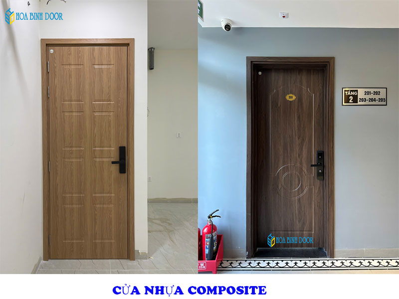 - – Cửa nhựa Composite phủ da (tấm film phủ trên bề mặt là lớp nhựa PVC giả vân gỗ).