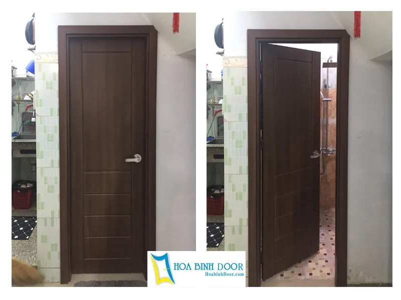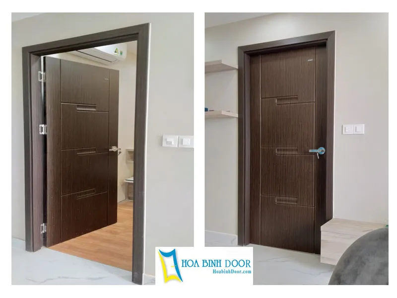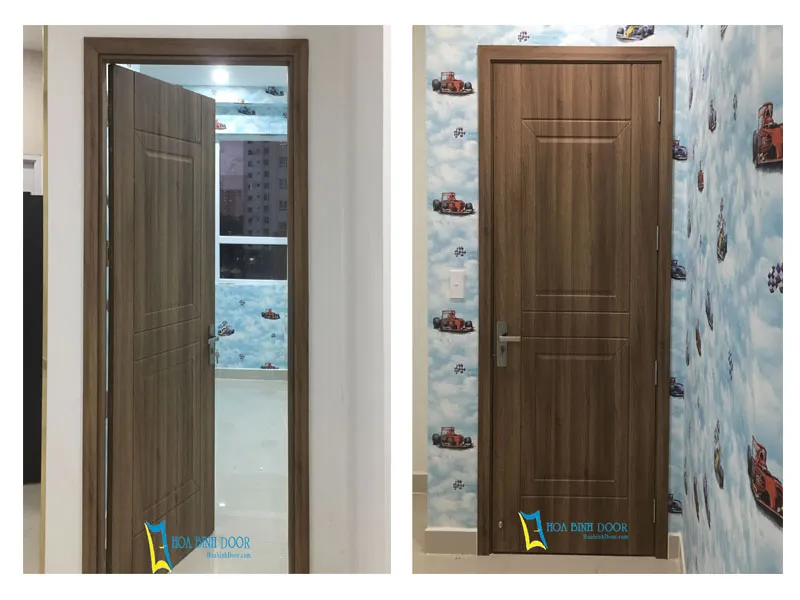 - Cánh cửa: Được ép đùn nguyên khối từ bột gỗ + nhựa PVC + phụ gia chống cháy, chống ẩm.