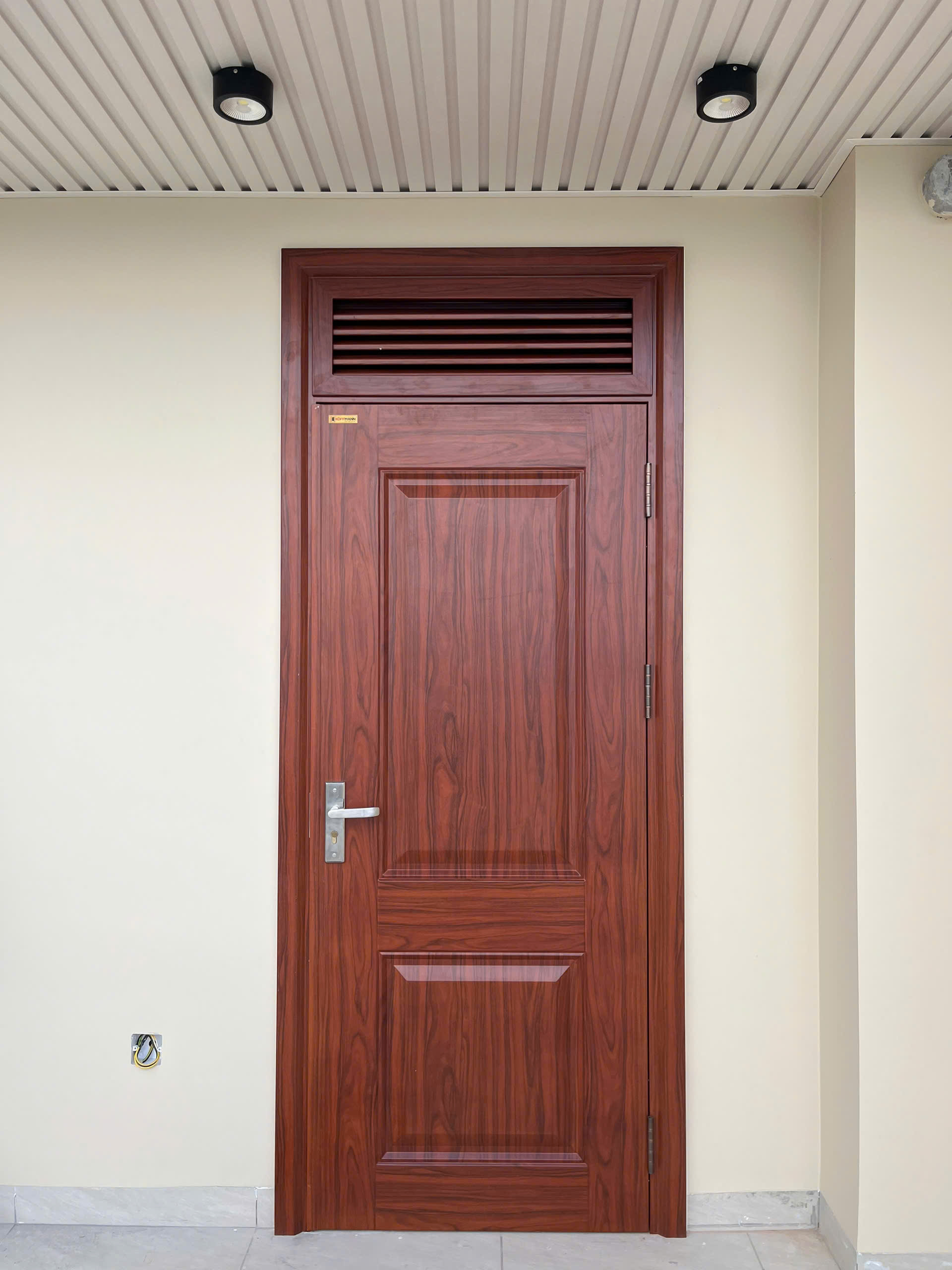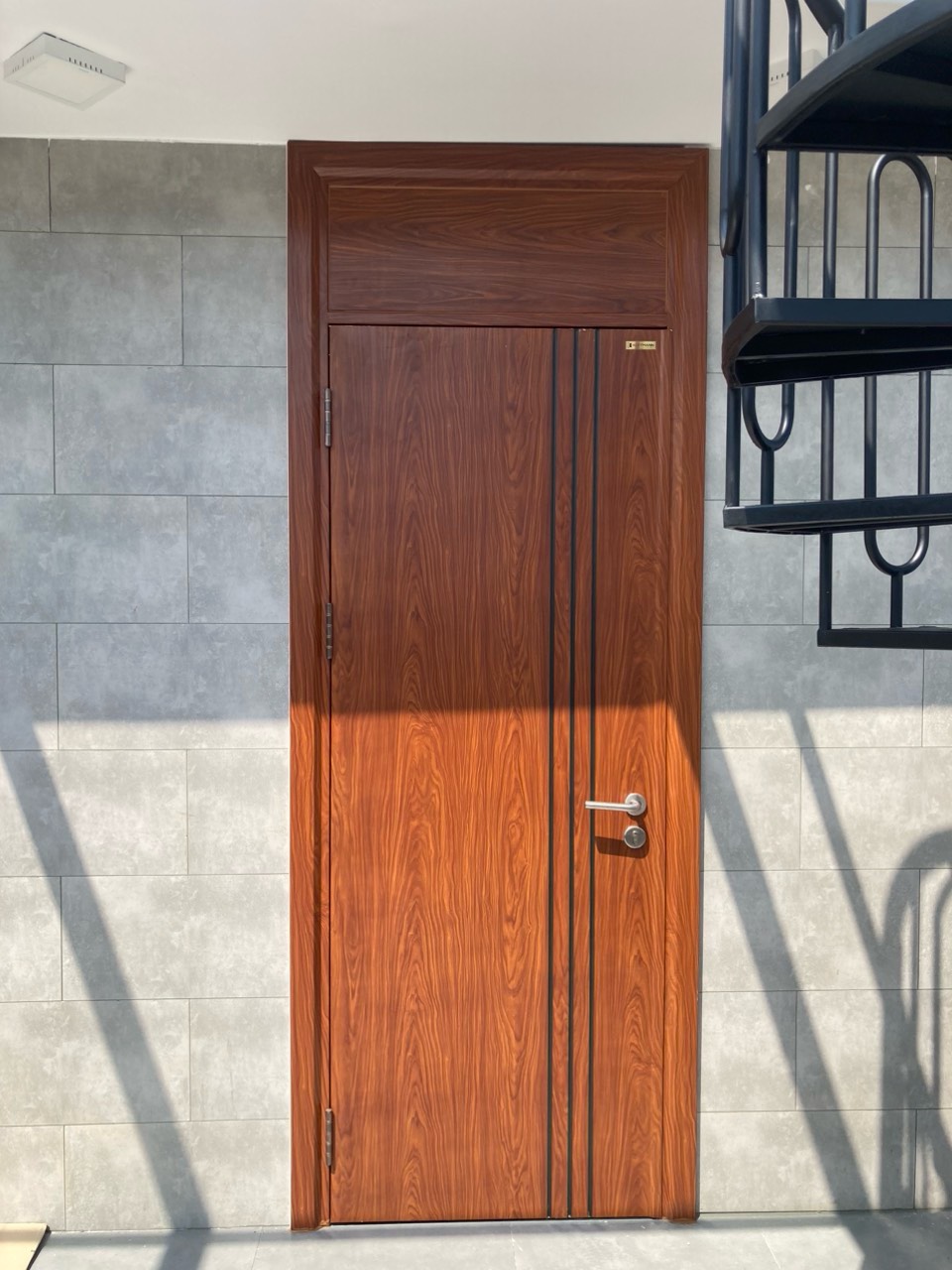 👉 Nhìn bên ngoài, cửa có vẻ đẹp sang trọng như gỗ tự nhiên, nhưng bên trong lại là kết cấu thép chắc chắn, giúp tăng độ bền và tuổi thọ sử dụng.