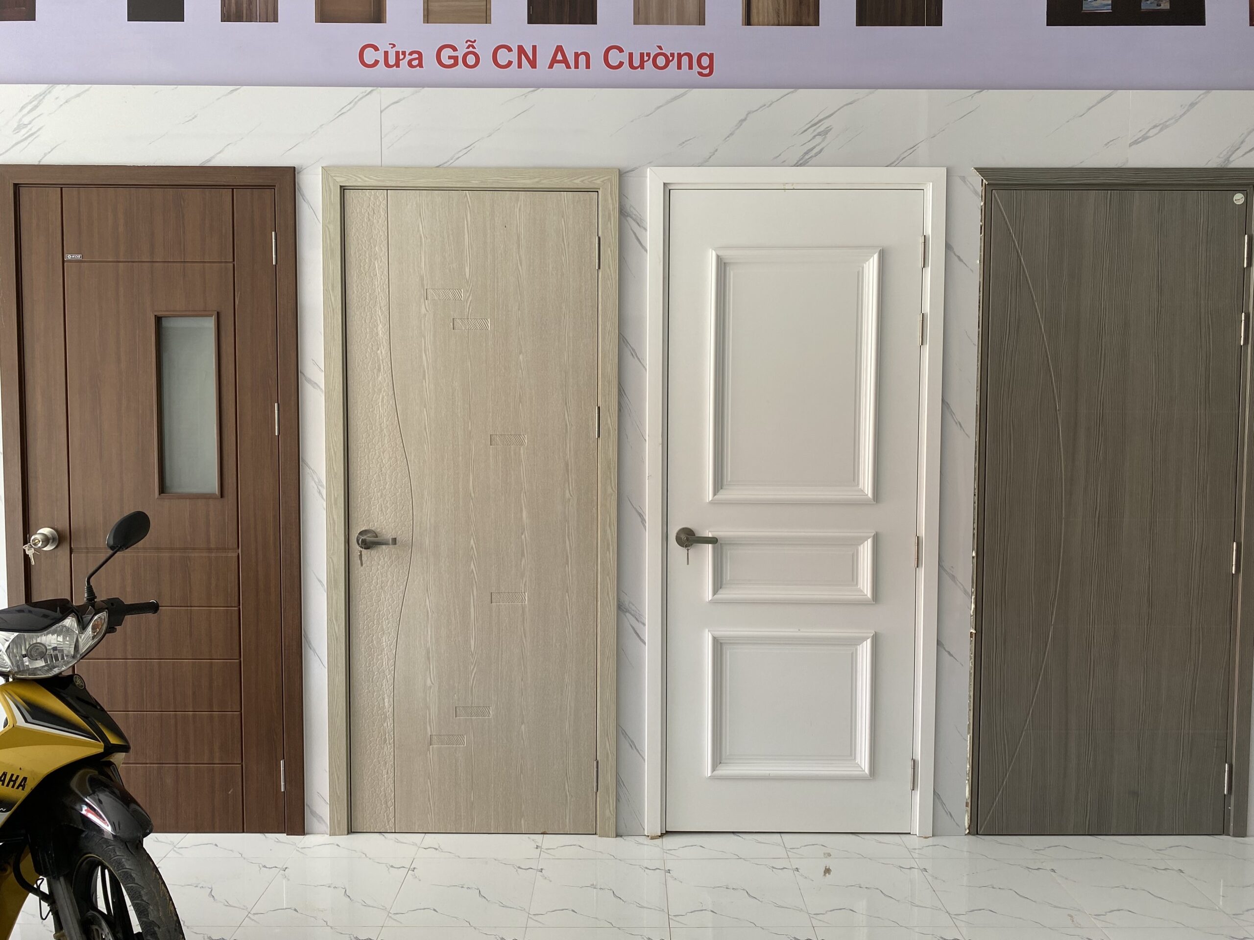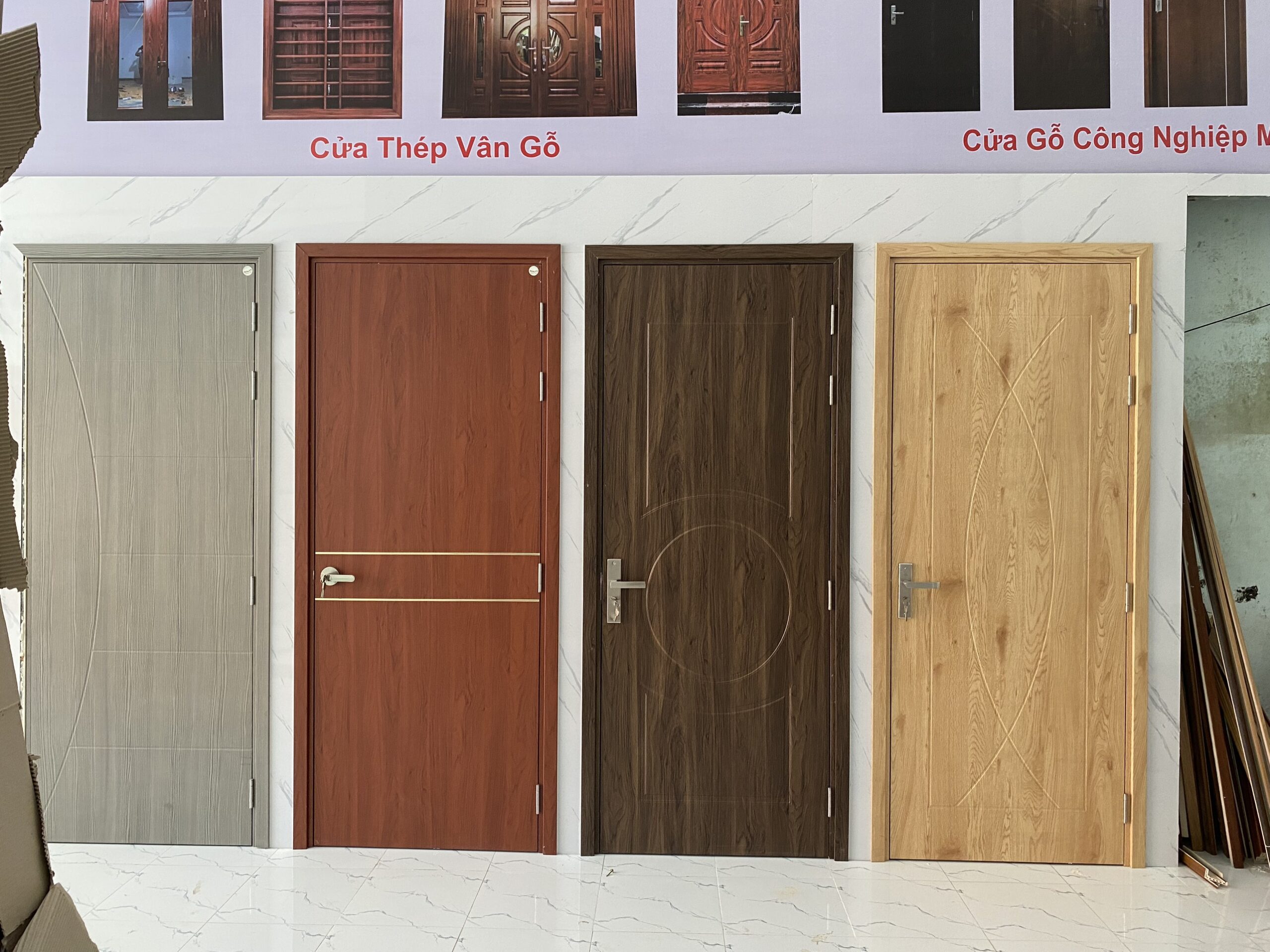 Các mẫu cửa nhựa – cửa gỗ – cửa thép vân gỗ trưng bày tại showroom cửa Long an